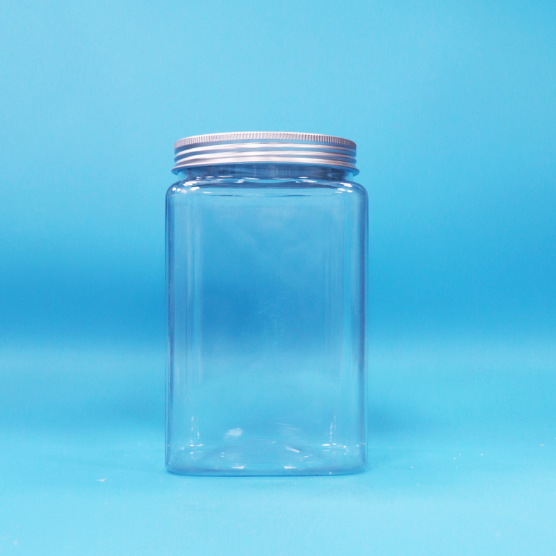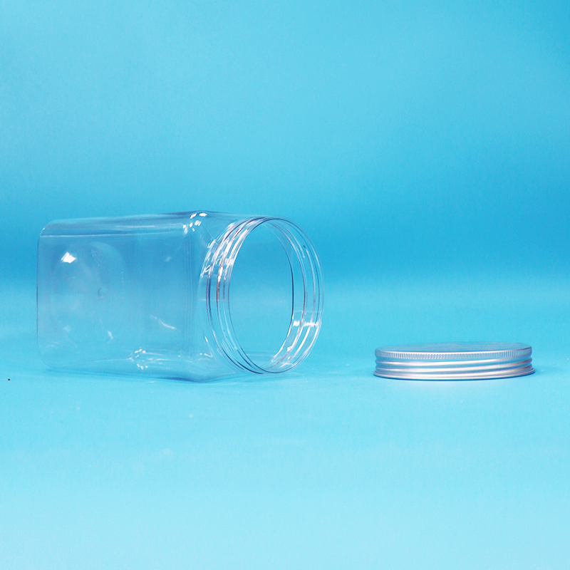 ขวดโหลพลาสติก PET ใสทรงเหลี่ยม ปราศจากสาร BPA สำหรับใส่ขนมและลูกอม พร้อมฝาเกลียวอะลูมิเนียม