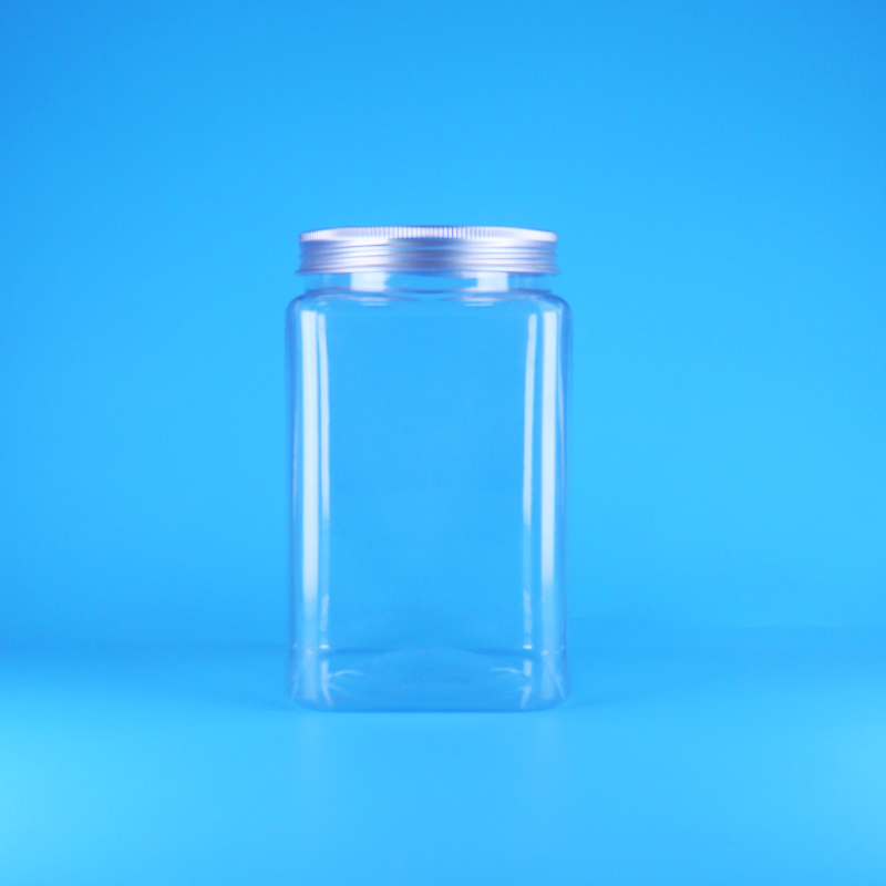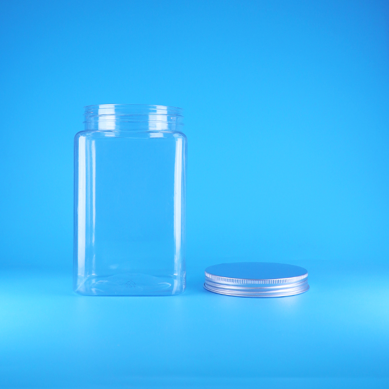 ขวดโหลพลาสติก PET ใสทรงสี่เหลี่ยมราคาถูกจากจีน พร้อมฝาเกลียวอะลูมิเนียม